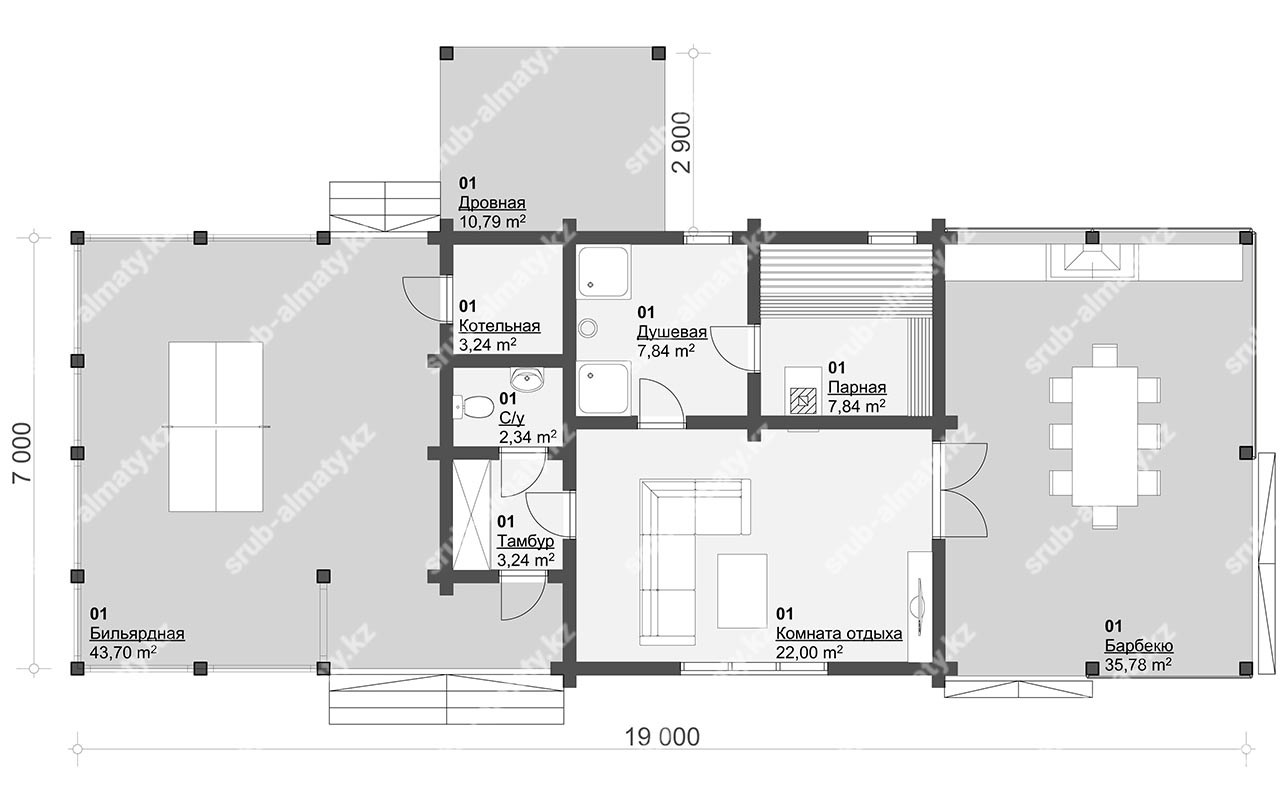 S Общая - 121 м.кв Материал - брус 200мм. Объем материала - 46 м.куб S кровли - 182 м.кв Осевые габариты - 10x19 м. H1 - 2,6 + м.